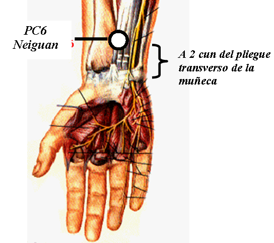 Como se muestra en la figura, este punto se localiza a 2 cun del pliegue transverso de la muñeca.